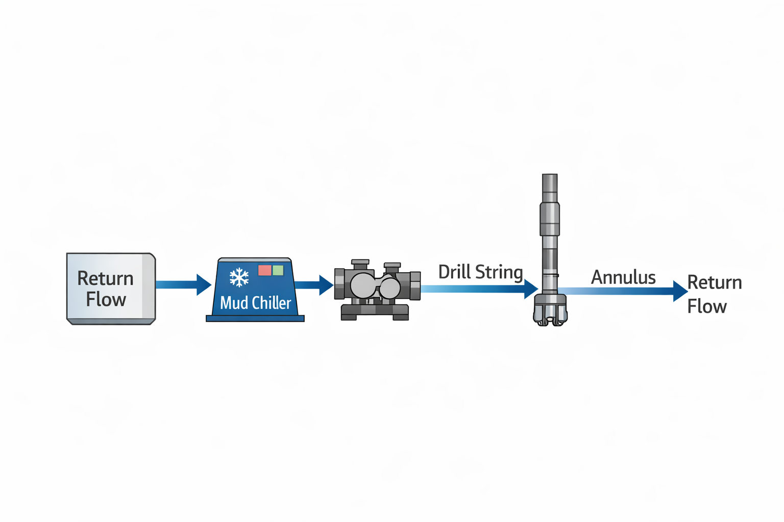 Lowering the surface mud temperature effectively resets the thermal profile of the circulating system. As the fluid travels down the drill string, it continues to absorb heat from the formation, but from a cooler starting point. This delays the onset of high bottomhole temperatures and reduces the peak thermal exposure experienced by the BHA, MWD/LWD tools, and motors.