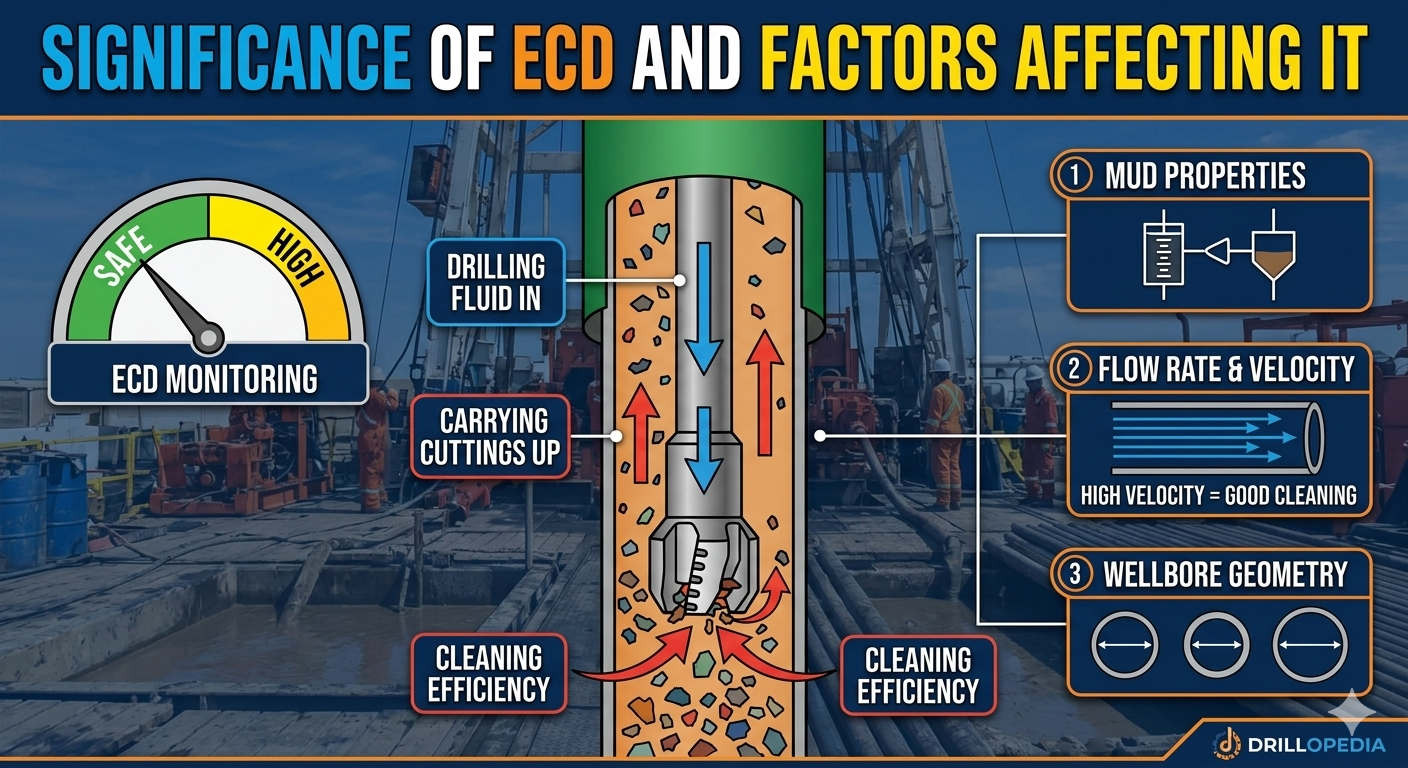 Equivalent Circulation Density (ECD) is the dynamic density of circulating mud in a borehole. It calculates the pressure exerted on the borehole wall during mud circulation. Any fluid column exerts a pressure equivalent to its hydrostatic head on the walls of its container. Similarly, the drilling fluid also exerts pressure on the borehole, equivalent to the mud column's hydrostatic pressure, and is a function of the mud density. However, the pressure under dynamic conditions is higher than under static conditions. This dynamic pressure, expressed in terms of equivalent mud weight, is called Equivalent Circulation Density (ECD)